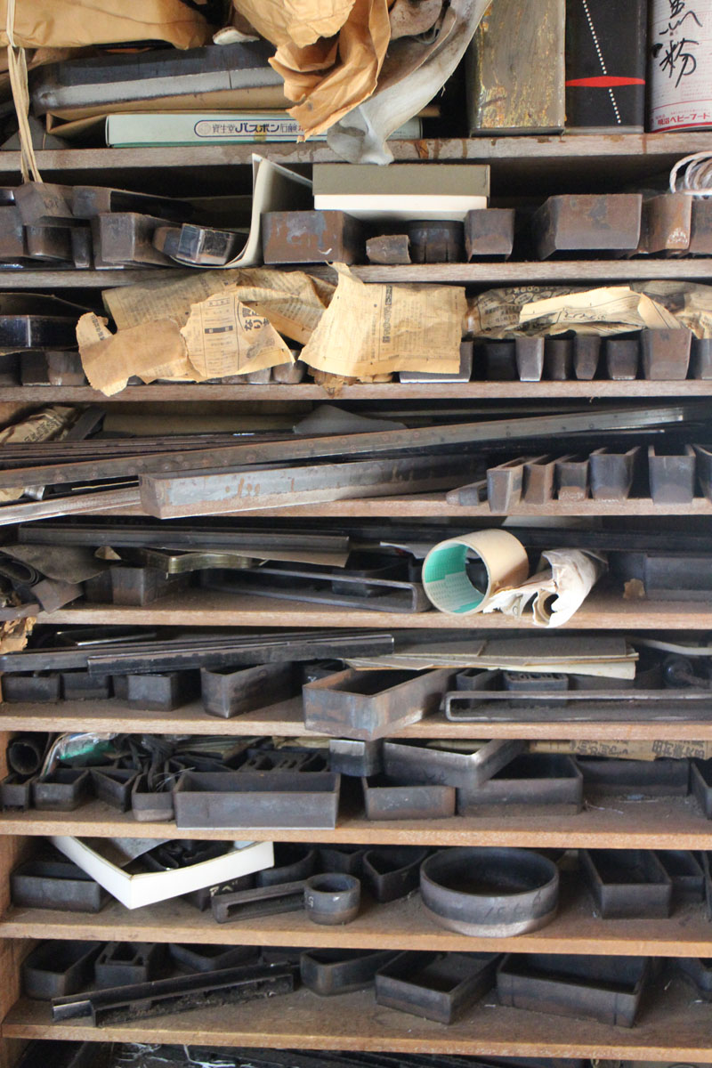 抜き屋は製品になる前の綿やナイロンの原反を、絞り袋の形に抜くのが主な仕事です。原反を丁寧に機械の寸法に切り、それを重ねて型の付いたプレス機に入れ『ドスンッ』と抜く。一枚の原反から多く抜くための型の配置や角度の工夫は職人技です。